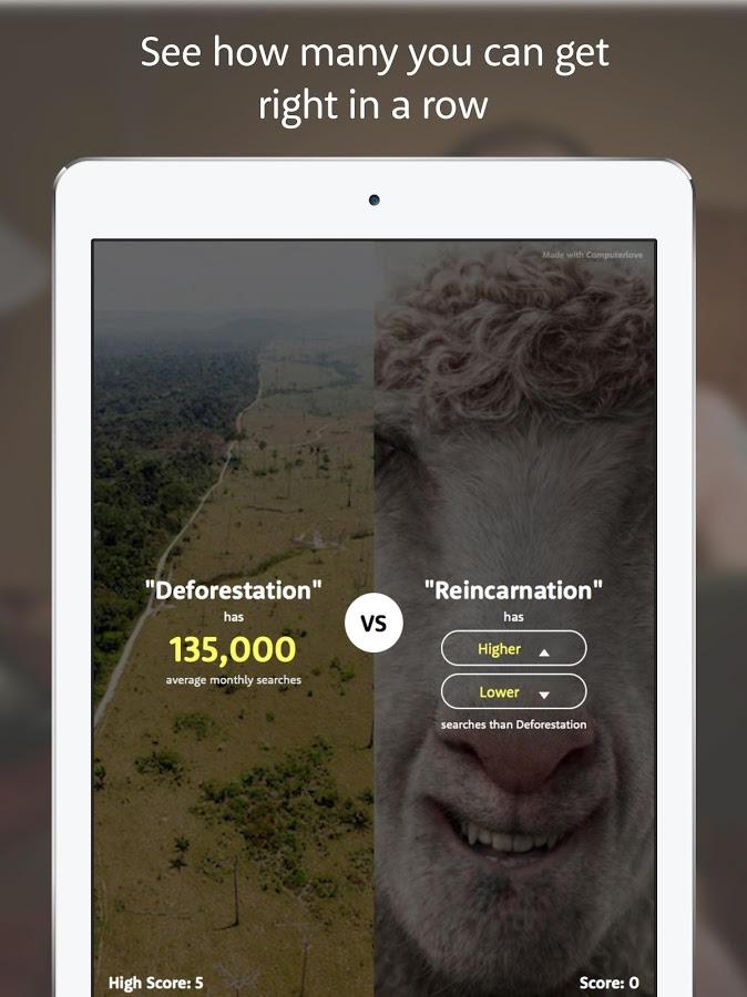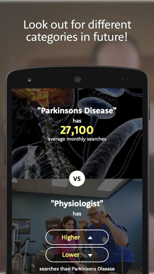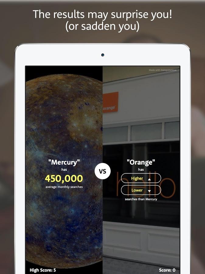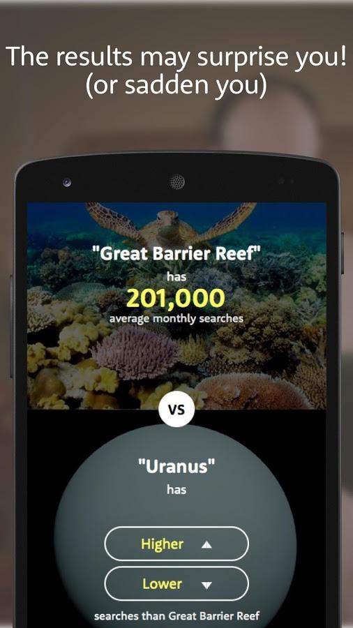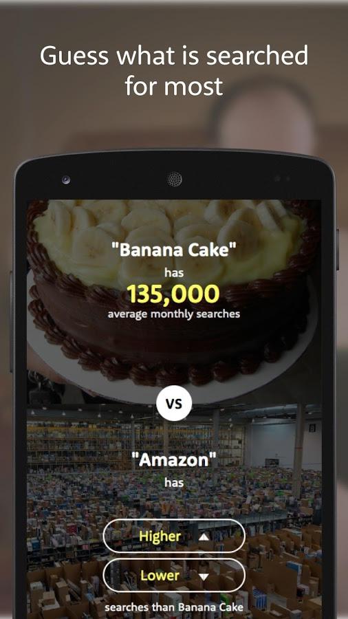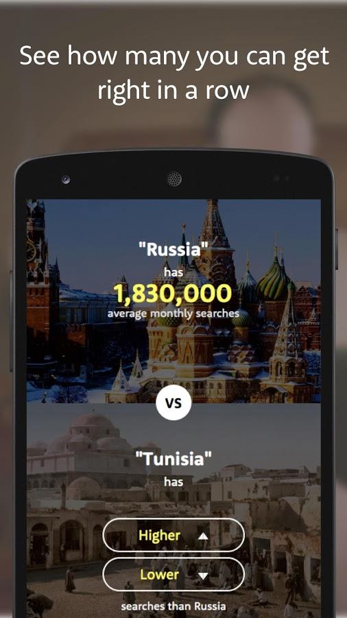 The Higher Lower Game – addictive puzzle Game on Android where your task will be to identify the most popular search trends of Google. If you like puzzles and want to know what is the most popular query in Google, then this game is for you. Play this game your task will be to choose a popular query in relation to others or not. Selecting the correct answer, you will move on, and try to set your highscore in this game. All the questions in this game randomly that will not let you get bored. Choose what is more popular in the search googol refugee crisis or America s new President Donald trump. The game will allow you to kill the time and enjoy it.