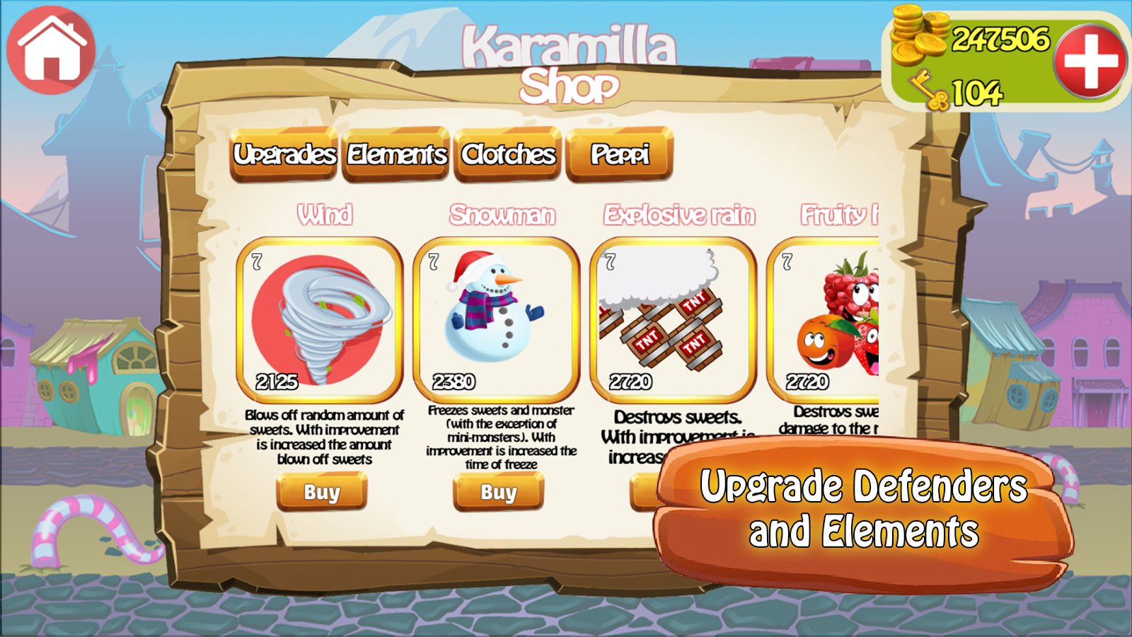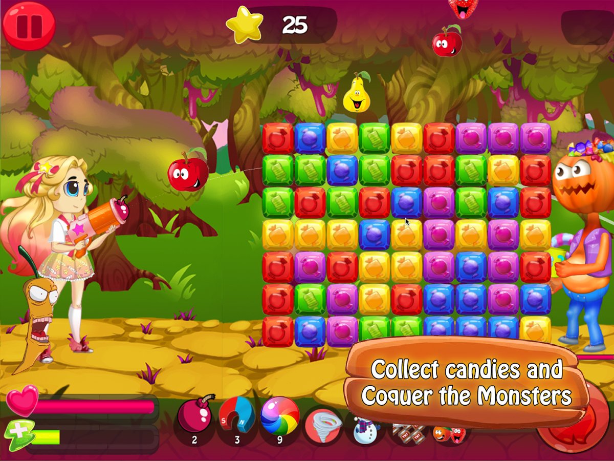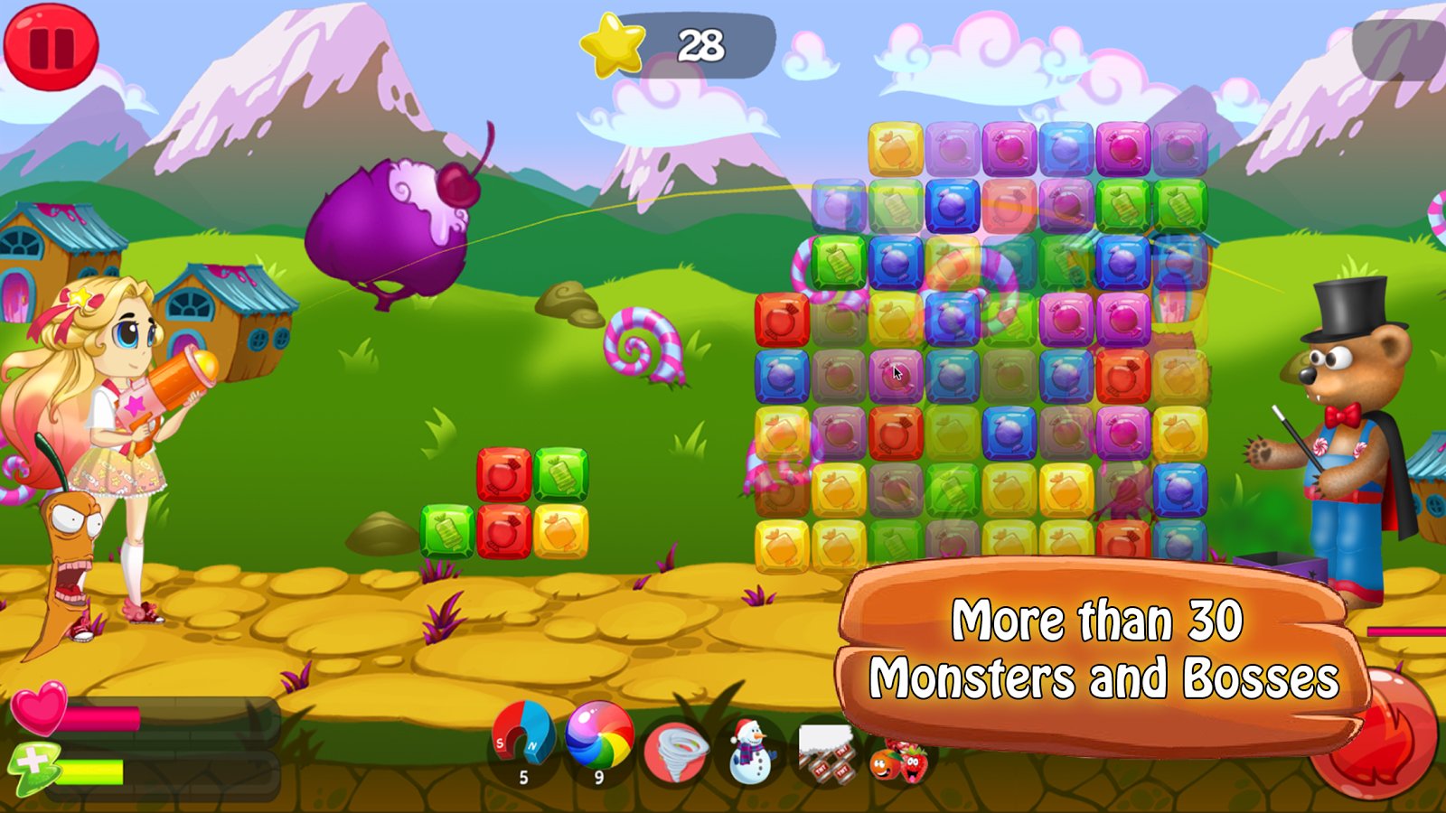 Karamilla - candy monsters – a fascinating game on Android, which combines several genres such as: 2 in a row, arcade and adventure. In this game you will find yourself in the beautiful country of Suitland where the confectionery factory produces a variety of sweets. At one point the country changed its course, the confectionery factory meteorite fell and all the sweets turned into horrible monsters. These monsters in the form of candies, cookies, toffee, popcorn, marshmello and Chupa Chups under the leadership of the terrible Caramillo decided to take over fairyland. Match two or more objects in a row and blow them up. Go through exciting levels of this game and stop raging sweetness.