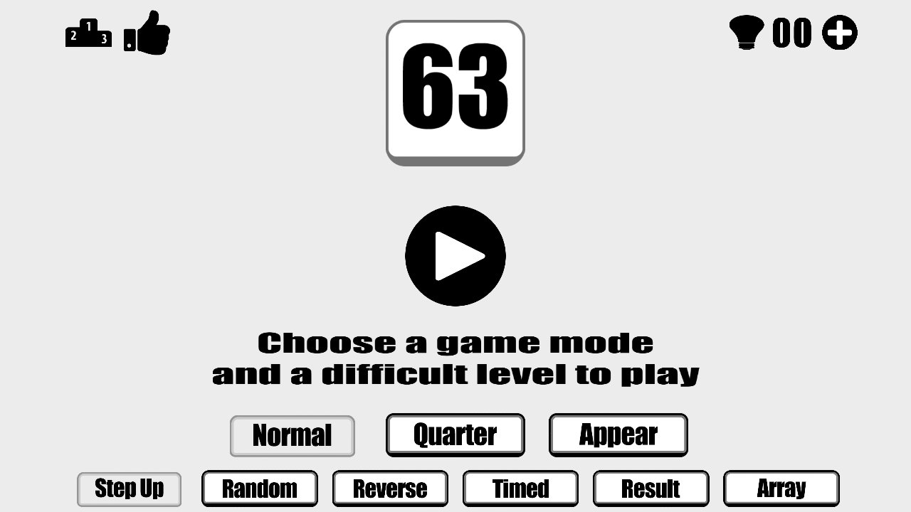 63 – Counting Number Puzzler is a puzzle game for Android where you will carry out not a difficult mathematical puzzles. Before you in this game will open the field is divided into cells, each of which are numbers from 1 to 63. Your task will be depending on the selected mode to look for certain numbers on the time to perform various mathematical operations and look for groups of numbers. Use all your powers of observation and logic in order to pass one another at many levels and set a record. The game features six game modes, 3 difficulty levels and numerous tips.