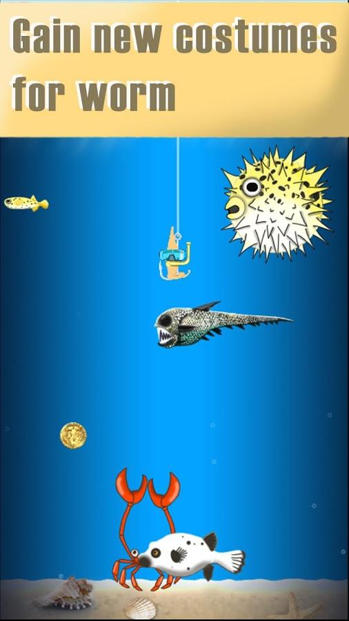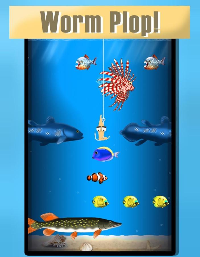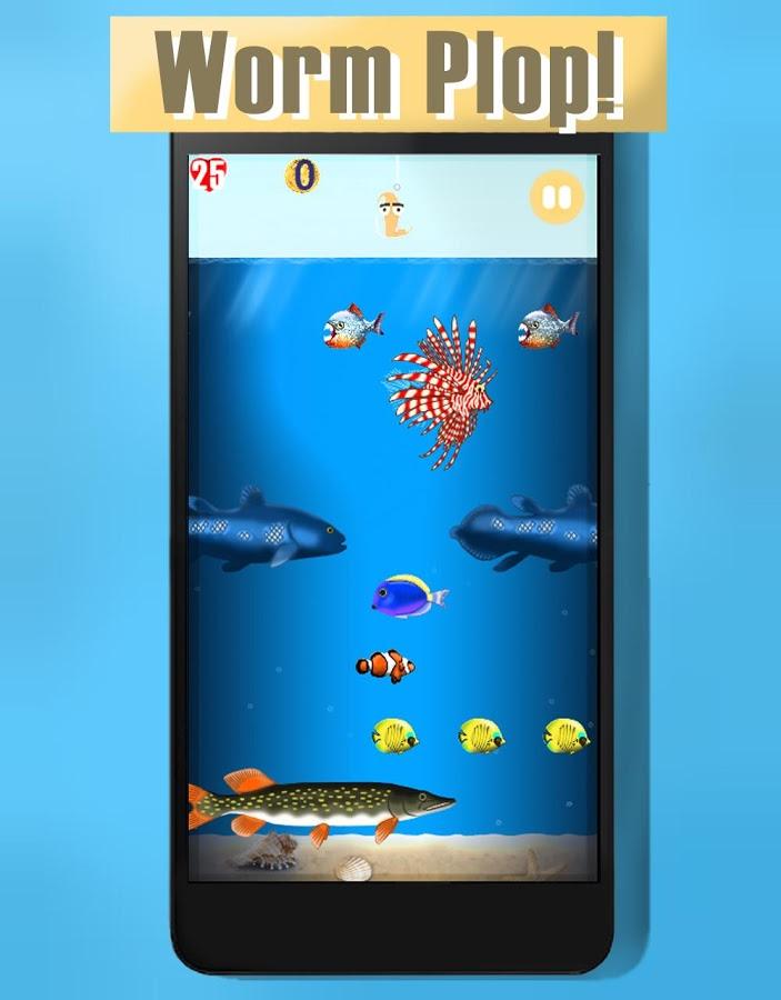 Worm Plop! catches fishes – an addictive puzzle game for Android where you will catch different fish on the worm. Lower the hook with the worm in the depths of the sea and catch rare and valuable fish species. In this game, the difficulty lies in the fact that you need to choose the right time for immersion of the worm to catch the fish you want. All the game features more than 20 species of real existing fish, and they all have their unique maneuvers and a style of behavior. Accumulate points and get your worm new costumes and equipment. Touch the screen at the right moment to the worm was sinking, stayed or zametalsya.