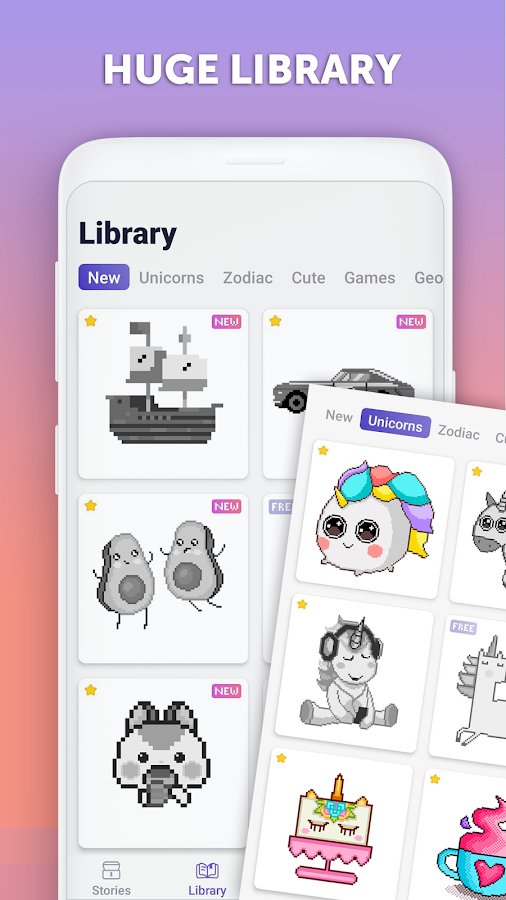 PixelArt: Color by Number, Coloring Book, Sandbox – an entertaining game where you will paint pictures by numbers. Now to create pixel images has become much more interesting and easier. Just touch the screen with the selected color and paint the desired cells, the application will not allow you to go beyond the boundaries. Play this game at any free time and share bright and vivid pictures with their friends. The game will also give you a huge library where everyone will find suitable pictures of animals, flowers, holiday decorations and more. Choose the appropriate level of difficulty ranging from easy for kids to difficult.