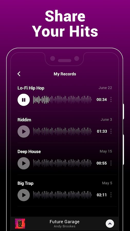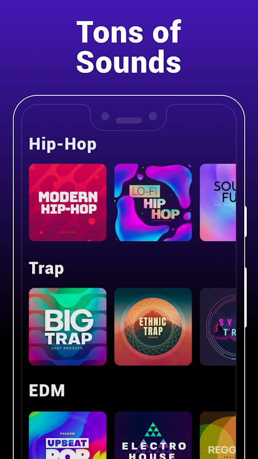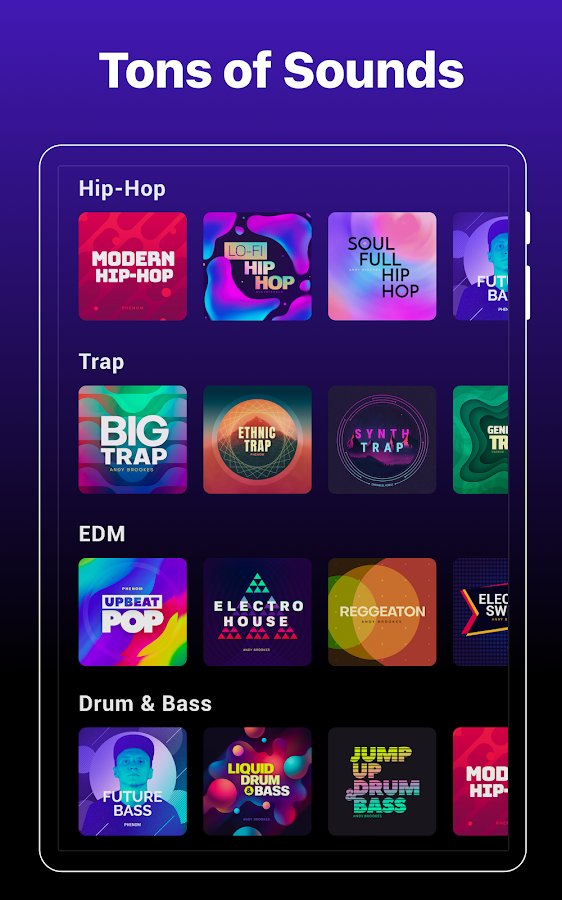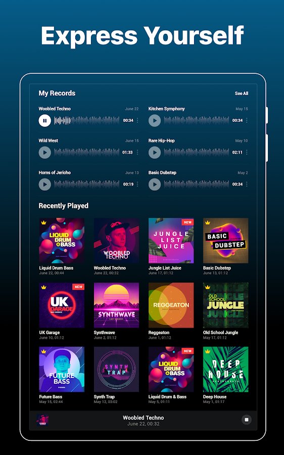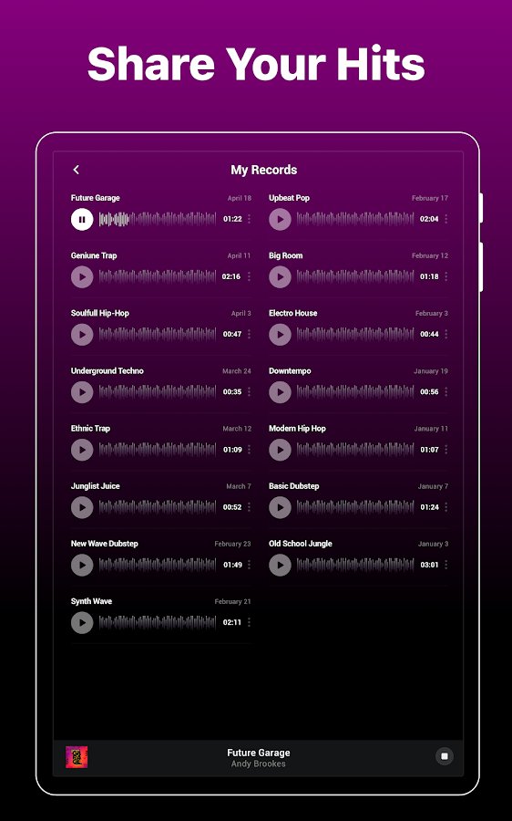 - an Extensive library of unique non-standard audio tracks. For a start, there look interesting to you songs – here are the most popular genres: hip hop, club music, house, dubstep, drum and bass, trap, electronic music, etc Groovepad you can create and own music, and remixing;