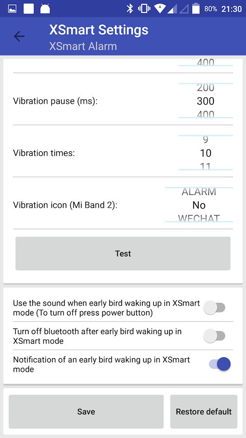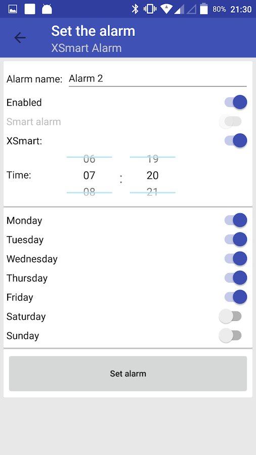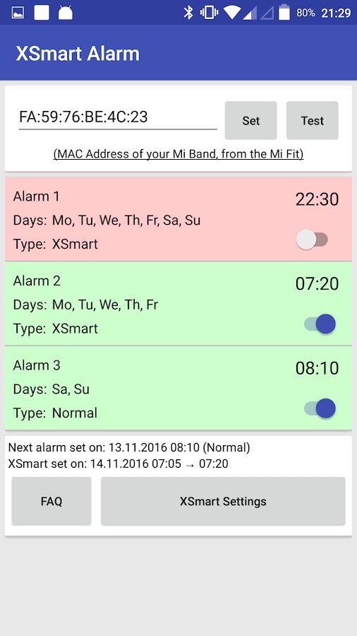 Smart Alarm for Mi Band (XSmart) is a useful companion app for the smart bracelet Xiaomi Mi Band on all versions. It activates the smart alarm clock which is not present by default on all the watches, starting with the second version. Smart alarm helps you Wake up at a specified time. The phone for 30 minutes (configurable) before the set time will begin to determine the phase of sleep and begin to Wake you, if it s a phase of light sleep. Vibration, and the sensitivity of the detection phase can be set manually.