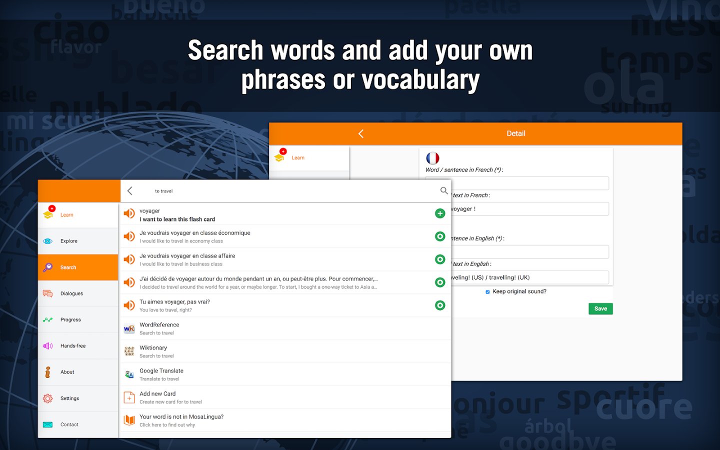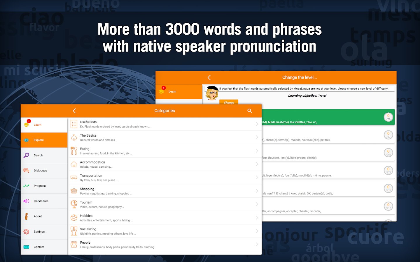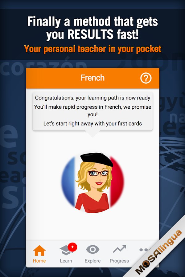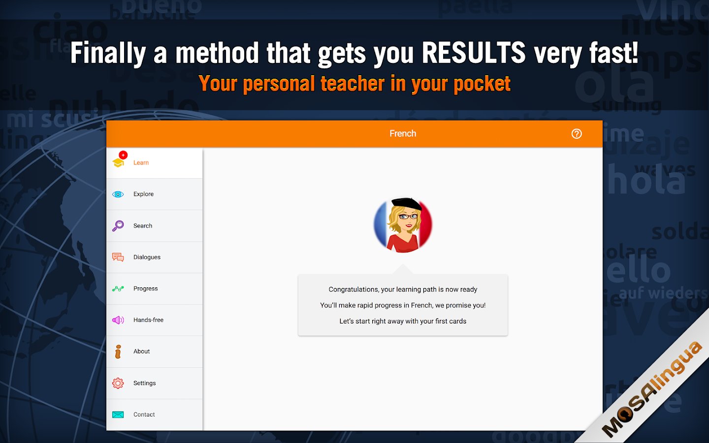 Learn French with MosaLingua - Learn French has become much easier than you thought. This app will allow you to learn and improve your French language using various features (from words to dialogue).The development belongs to linguists from France and two developers who uses MosaLingua on a daily basis.