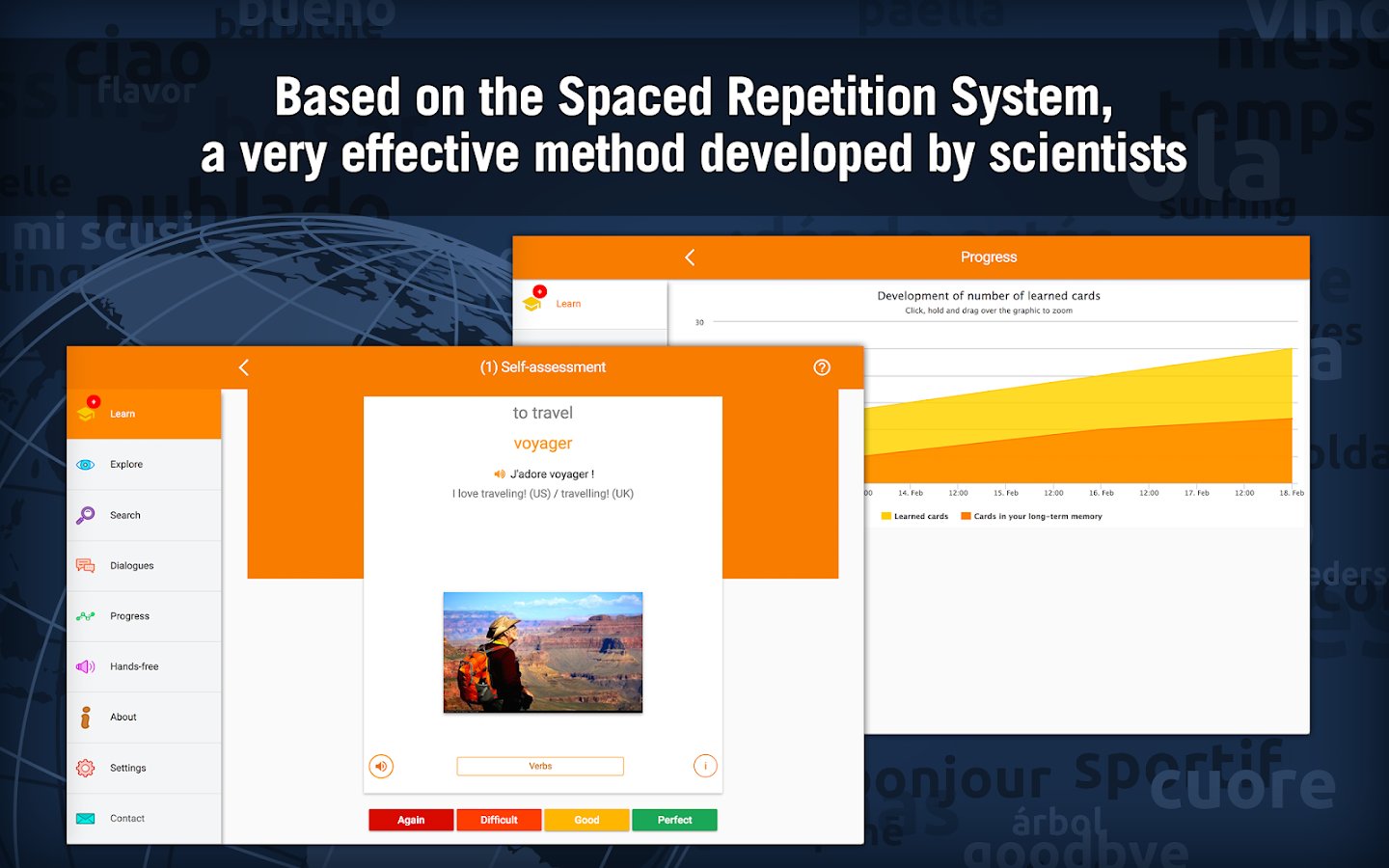 Do just 5 minutes a day, and, two months later, will already know about 600 key words and phrases that are used in France every day.The application itself consists of 3000 cards with different phrases and words of the French language; 14 different categories and 100 subcategories to choose from; up to 10 levels of difficulties in each category; 17 dialogues that can occur with you on trips or on the telephone; bonus materials; online dictionaries, and more.